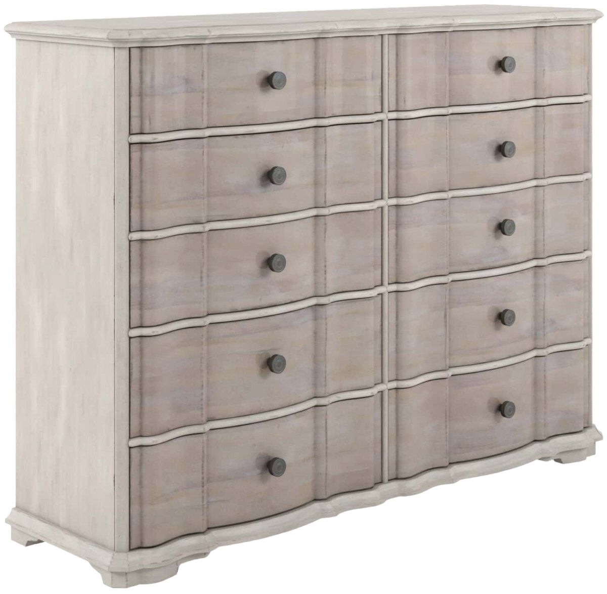 Concave shaped drawer fronts feature Belgian Ivory parting rails