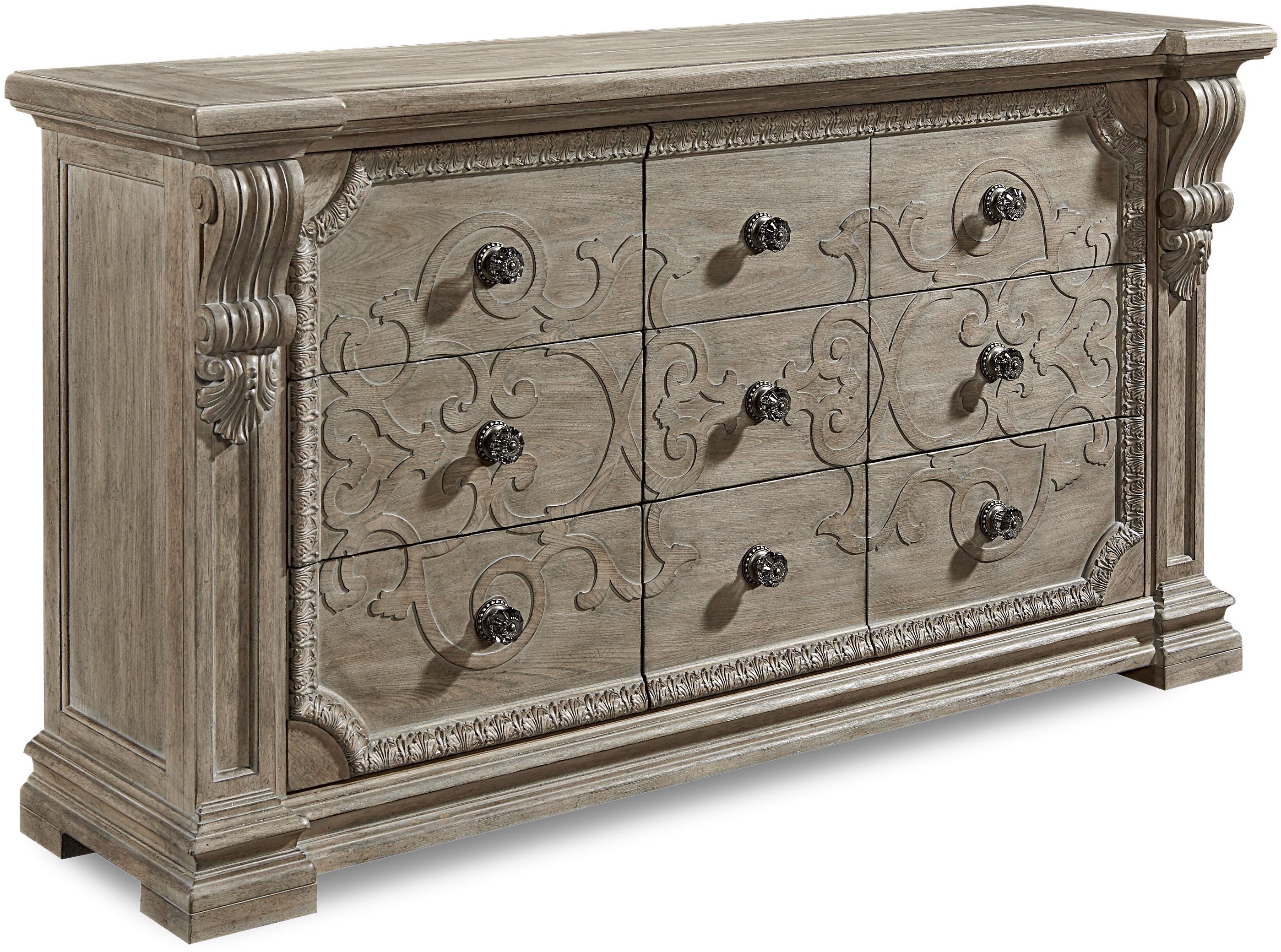 With ornate fretwork overlay, lamb’s tongue molding and bold carved acanthus leaf corbels on the front pilasters, the Wren Dresser recalls the robust neo-classical architecture of the eighteenth century. The dresser is constructed of parawood solids and cathedral elm veneers, and is available in Parch, a light open-grained finish, or Mist, a neutral aged gray paint.