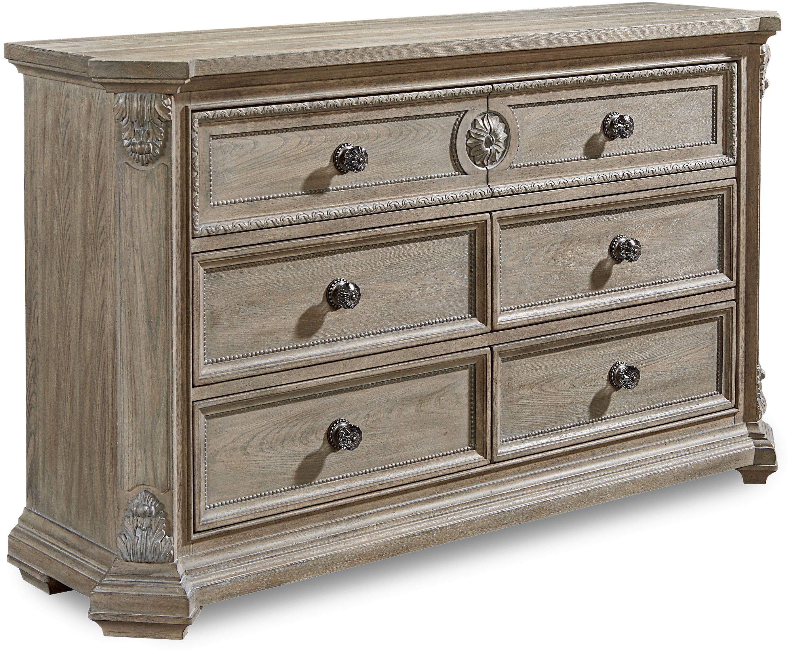 The six-drawer Grayson Dresser features a broken bellflower medallion on the top two drawers, which are further embellished with a frame of lamb’s tongue molding. The angled corner posts have acanthus leaf carvings at top and bottom; the ornate cast metal drawer pulls echo the carved detail. The dresser is constructed of parawood solids and cathedral elm veneers, and is available in Parch, a light open-grained finish, or Mist, a neutral aged gray paint