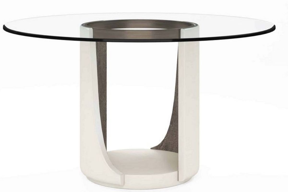 Real tables have curves. This circular beauty is sure to turn heads, from the swooping curves of a base in a smooth alabaster hue to the band of burnished bronze finish metal supporting an elegant glass top.Read More