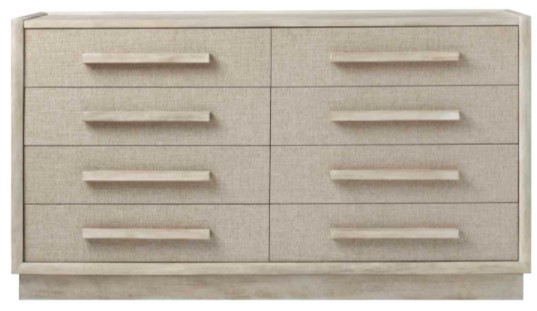 Add style to your room with this dresser from Cotiere collection. Shown in Linen finish. This dresser features four drawers made of Parawood Solids, mixed plit Cathedral Quarter-White oak veneer and fabric that is perfect in storing and organizing your stuff.Read More
