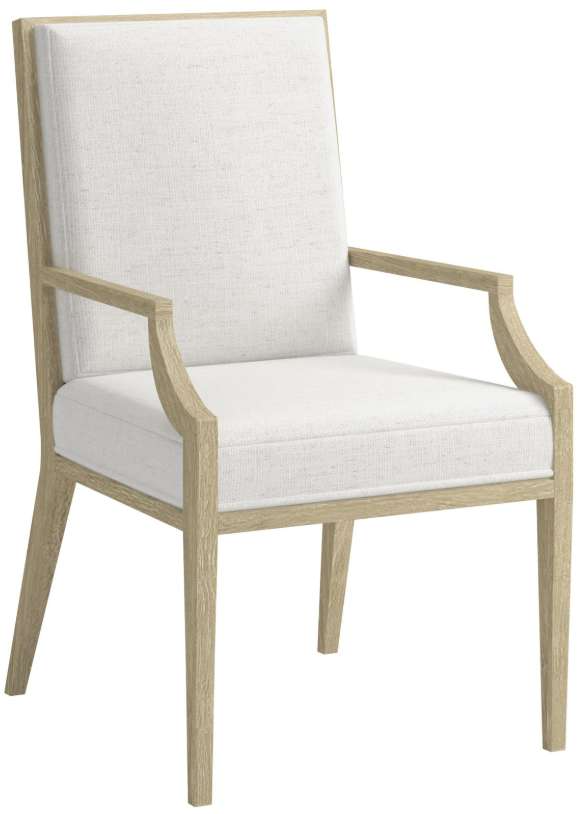 The chair features a straight, high back and a generously cushioned seat, both fully upholstered in a light, neutral fabric that complements a variety of dining aesthetics. The chair's frame, crafted from a light, natural wood, showcases a sleek, minimalist design, with gently curved armrests that add a touch of elegance and support. The clean lines of the frame are further enhanced by the slender, tapered legs, which contribute to the chair's overall sense of lightness and sophistication. The Eave II Dining Armchair is designed to provide both comfort and style, making it a perfect addition to any dining table, whether for everyday meals or formal gatherings. Its refined design allows it to seamlessly integrate into a variety of interior styles, adding a touch of understated luxury.