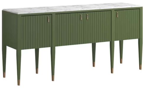 The sideboard features a smooth, luxurious marble top, providing a beautiful and durable surface for serving and display. The cabinet doors and drawers are adorned with a unique, vertical ribbed texture, adding a textural element and visual interest. The sleek, elongated hardware complements the contemporary design. The sideboard offers ample storage with its cabinet space and drawers, making it perfect for organizing dining essentials, linens, or media components. The piece rests on slender, tapered legs with metallic accent tips, adding a touch of refined elegance. The Eave II Sideboard is designed to be a statement piece, blending unique design with everyday functionality in a bold and sophisticated palette.