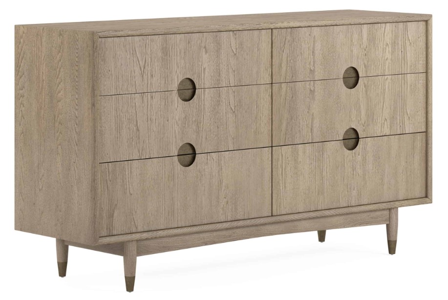The minimalist lines of this dresser are subtly embellished by an array of circular cutouts, playfully arranged to suggest the pips on a set of dice. Each cutout is backed in antique gold finish metal, contrasting beautifully with the organic beauty of natural wood grain in a warm grey elm veneer.Read More