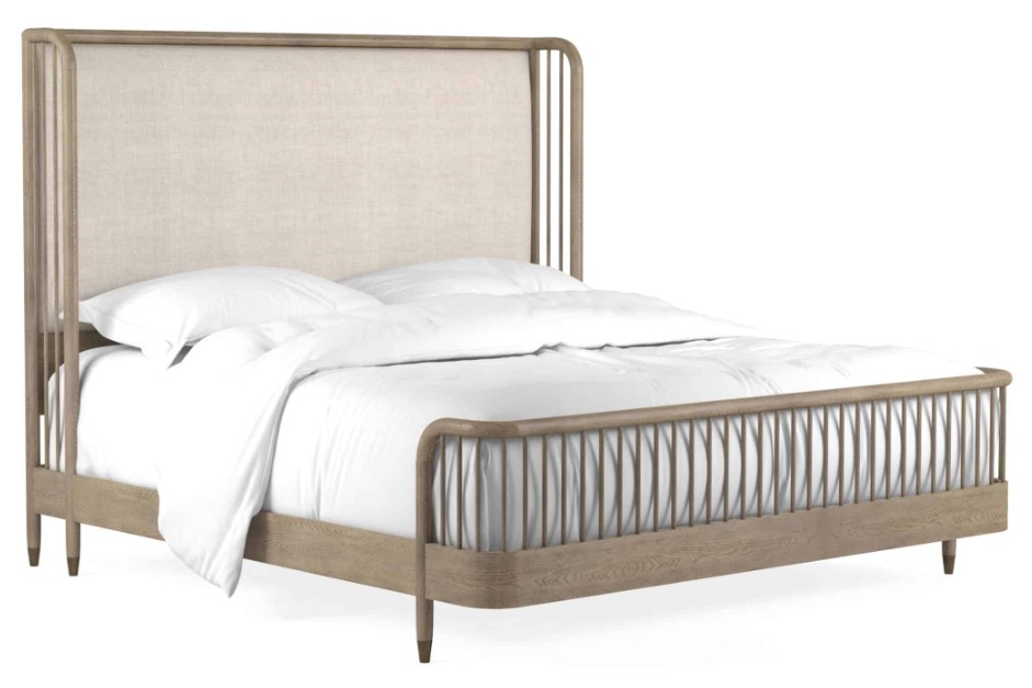 A sense of structured beauty makes this bed the centerpiece of any space. A dramatic 64” headboard and mid-century-style spindle rail with tapered legs add a bold vertical element to the bedroom, softened by gently curved corners and a central panel upholstered in a woven fabric.Read More