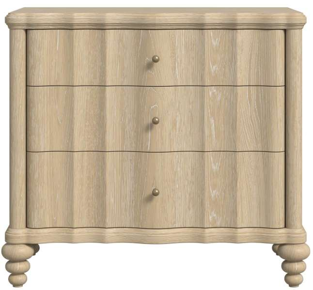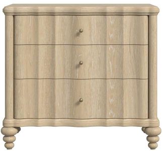 The soft, natural finish evokes the timeless charm of aged wood, while the delicate scalloped apron and turned feet add a touch of feminine whimsy. With its three drawers providing ample storage, this nightstand seamlessly blends functionality with the lighthearted, inviting atmosphere that defines the Haven collection. Perfect for keeping essentials close at hand while adding a touch of enchanting style to your bedroom.