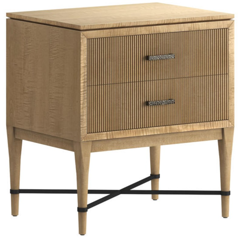 Classic contemporary 2 drawer nightstand in figured maple with grooved drawers, tapering legs and a metal X stretcher in bronze finish. A Celebration of crisp lines and beveled edges, this collection offers over 20 designs in figured maple veneer, complemented by fabric-wrapped, or organic jute cord accents. Perfect for metro, urban, or contemporary homes.Read More