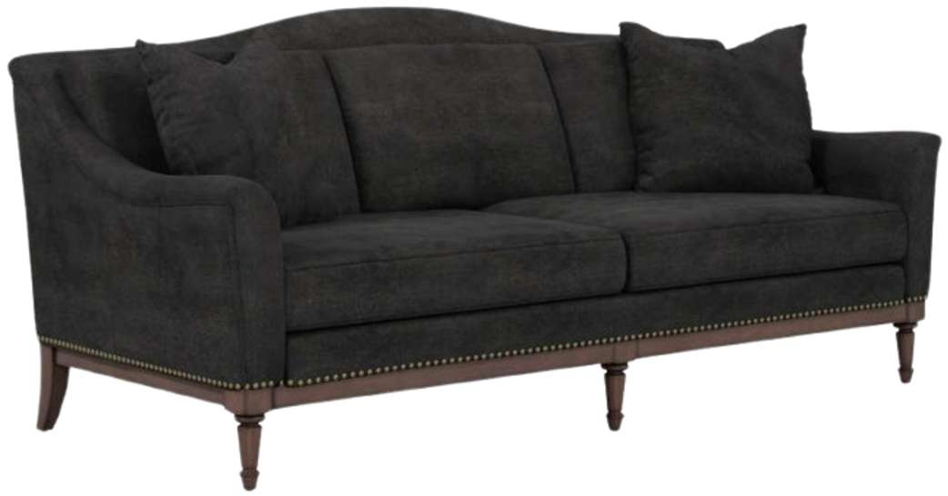 Accented with a deep brown wood base, fully turned front gets and antique brass nailhead trim, Magritte has all the makings of an updated traditional aesthetic. Its velvet charcoal upholstery grounds your living space, while two included toss pillows offer extra comfort when desired.