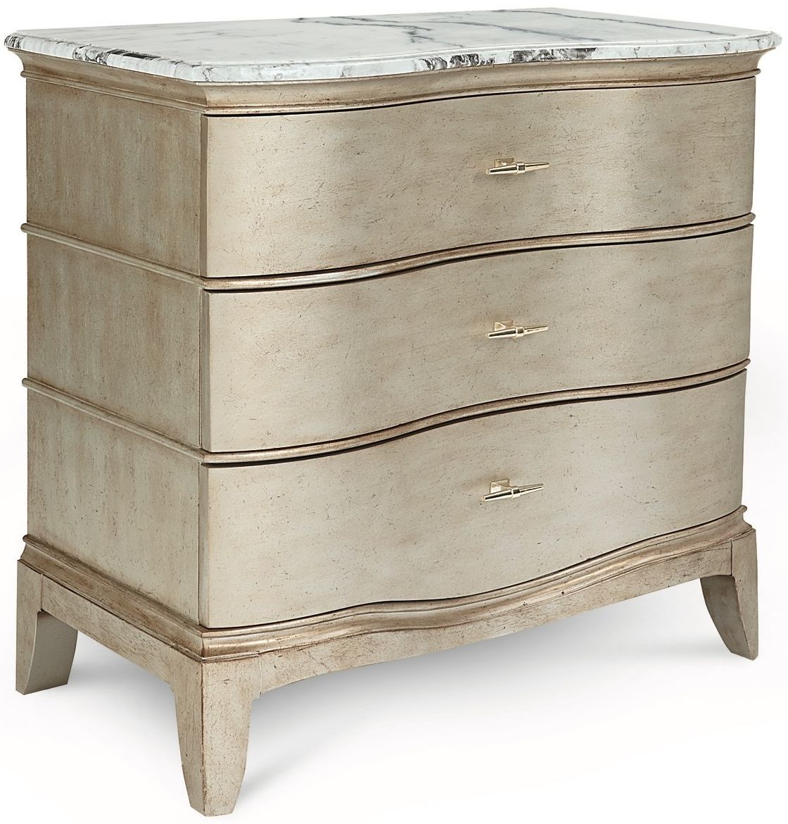 The handsome Starlite Bachelor Chest has three roomy drawers set into a gently curved serpentine front. The top of the chest is highly figurative polished stone; the body is finished with silver Bezel paint that has been glazed and gently aged for a soft sheen.