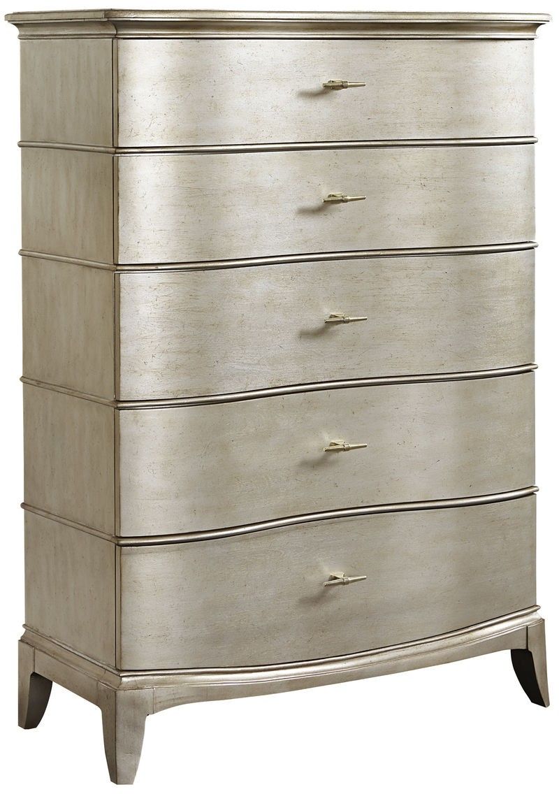 The classic chest-on-stand style is reinterpreted with a touch of Old Hollywood glamour. The serpentine Starlite Drawer Chest has five drawers and is finished in silver Bezel paint that has been glazed and gently aged for a soft sheen