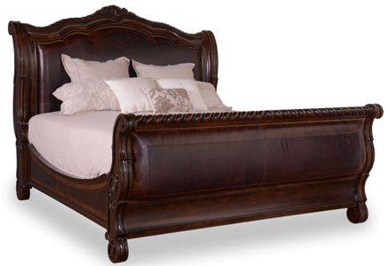 Valencia California King Upholstered Sleigh Bed features leather upholstery and a hand distressed Port finish.Read More
