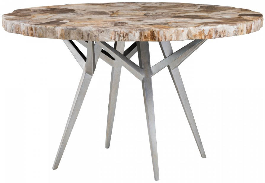 Live-edge contemporary design boasting a 50-inch asymmetrical top inlaid with fossilized shell standing on an iron base constructed of tapered legs and cantilevered supports in a silver finish with a hint of gold.Read More