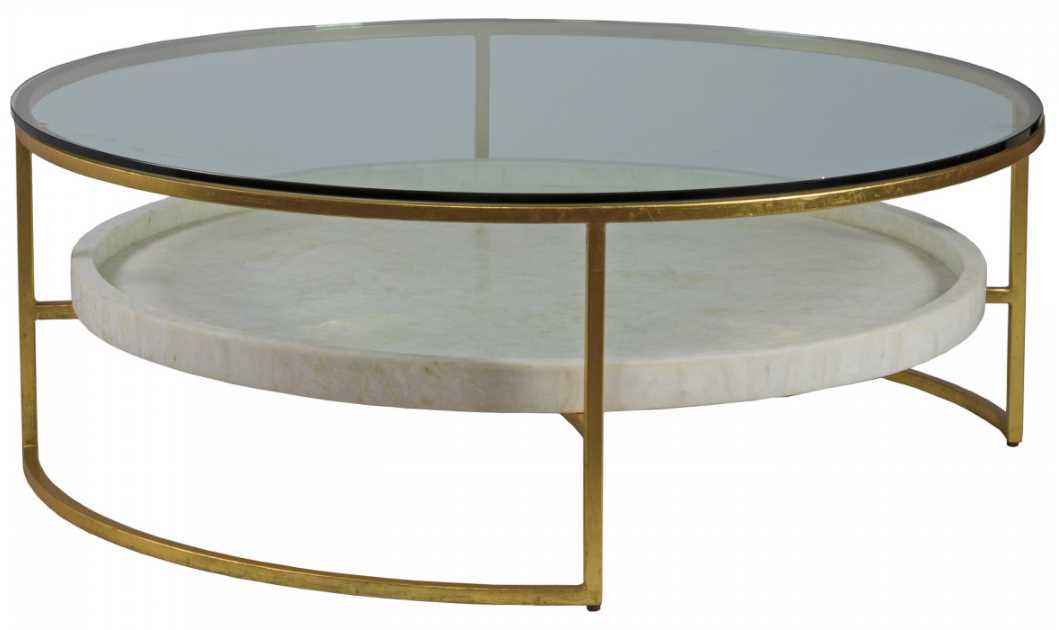 Iron base frame in a gold foil finish with a fossilized white crystal floating shelf, and lay on glass top. The fossilized white crystal stone will vary in color from piece to piece.Read More