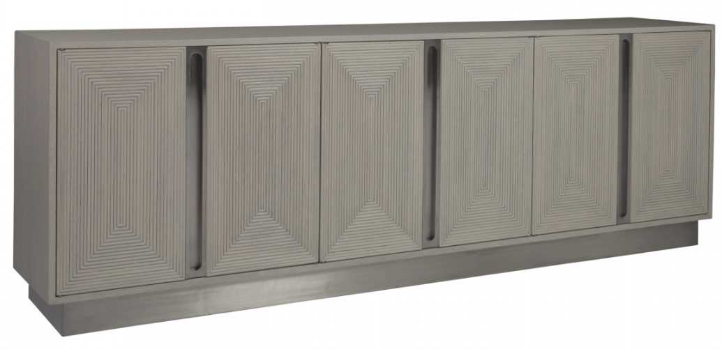 Grand credenza based on our Gradient motif, standing 101-inches wide and intended to anchor the largest of flat panel screens, featuring quartered white oak veneers in our Cerused White Grey finish. The long inset pulls and plinth base are brushed stainless steel.Read More