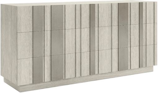 A pattern of metal and wood offers an interplay of light and shadow on the Tempo dresser. Six raised-panel drawer fronts have sandblasted aluminum overlays in Satin Nickel finish over wire-brushed oak in Larza finish. This beautiful modern dresser rests on a wood plinth base.Read More