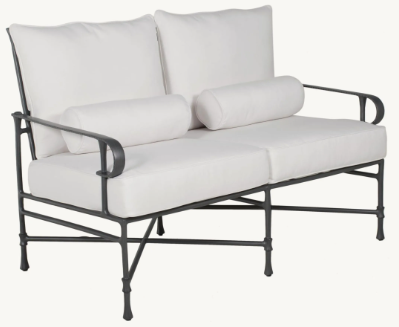 Beauty and elegance of a French garden design are found in the Bordeaux Cushioned Loveseat. Featuring a durable multi-stage powder coat finishing and optional artisan applied antiquing. Perfect option for smaller spaces, or paired with larger sofas.Read More