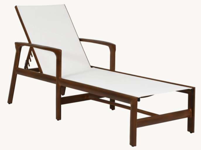 Shown in white fabric and brown metal finish. The Berkeley Sling Chaise Lounge offers supreme comfort and an attractive mid-century modern design that is handcrafted of durable cast and extruded aluminum.Read More