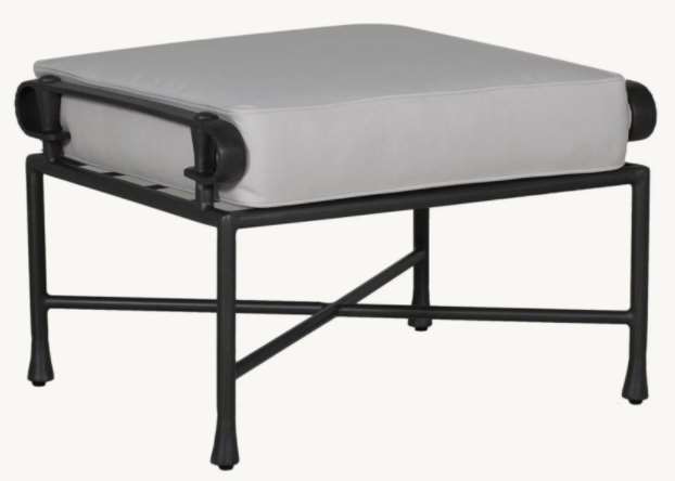 Beauty and elegance of a French garden design are found in the Bordeaux Cushioned Ottoman. Featuring a durable multi-stage powder coat finishing and optional artisan applied antiquing. Shown in light gray fabric and black metal finish.Read More
