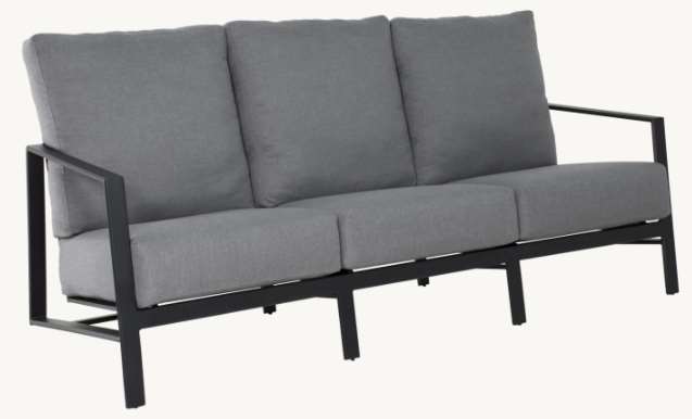 Shown in gray fabric color and black metal finish. With handcrafted extruded aluminum, a framed upholstered construction and oversized tailored seat and back cushions, the Prism Cushioned Sofa delivers the ultimate in leisure.Read More