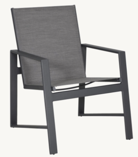 Simple linear arms, legs and back supports complete the Prism Sling Dining Chair designer look. With handcrafted extruded aluminum, a framed upholstered construction and oversized tailored seat and back cushions, the Prism Collection delivers the ultimate in leisure.