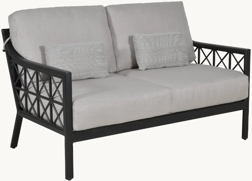 It features plush, tailored cushions available in a wide selection of sumptuous fabrics. The durable powder coated aluminum frame can be customized with any of our rich finishes and optional hand-applied antiquing.