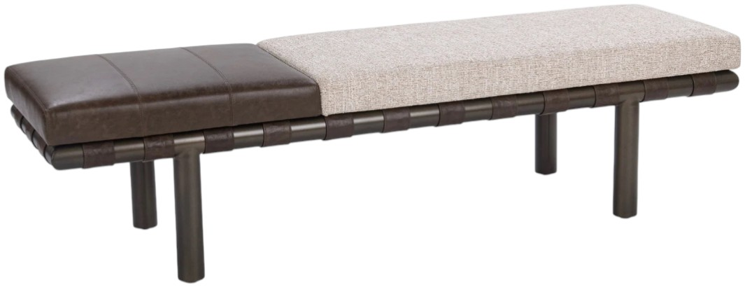 Add style and versatility to your home with this modern accent bench. Designed with sturdy iron legs, it combines top grain leather and soft fabric for a unique two-tone look. Perfect as an entryway bench, end-of-bed seating, or a living room accent piece, this bench blends durability and comfort.Read More