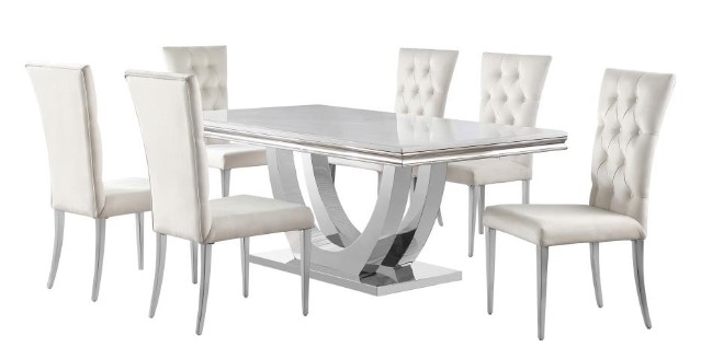 Bring together friends and family at this elegant, modern glam dining table set, featuring a stunning polished chrome finish throughout for a lustrous sleek expression. A demilune pedestal base offers an eye-catching sweeping silhouette as a spacious faux marble table top seats up to six comfortably.Read More
