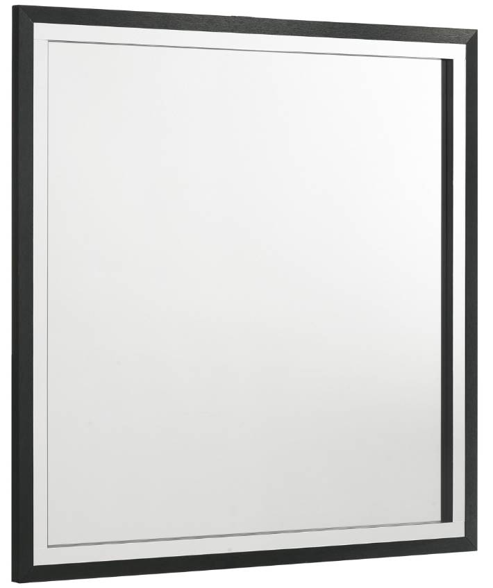 Put a glamorous finishing touch on your dresser with a modern framed mirror. Offering a polished touch of style, the mirror boasts a sleek, squared silhouette complete with a bold black finish. Gleaming chrome finish trim augments the front of the frame, creating a hint of coolness in an elegant bedroom.Read More