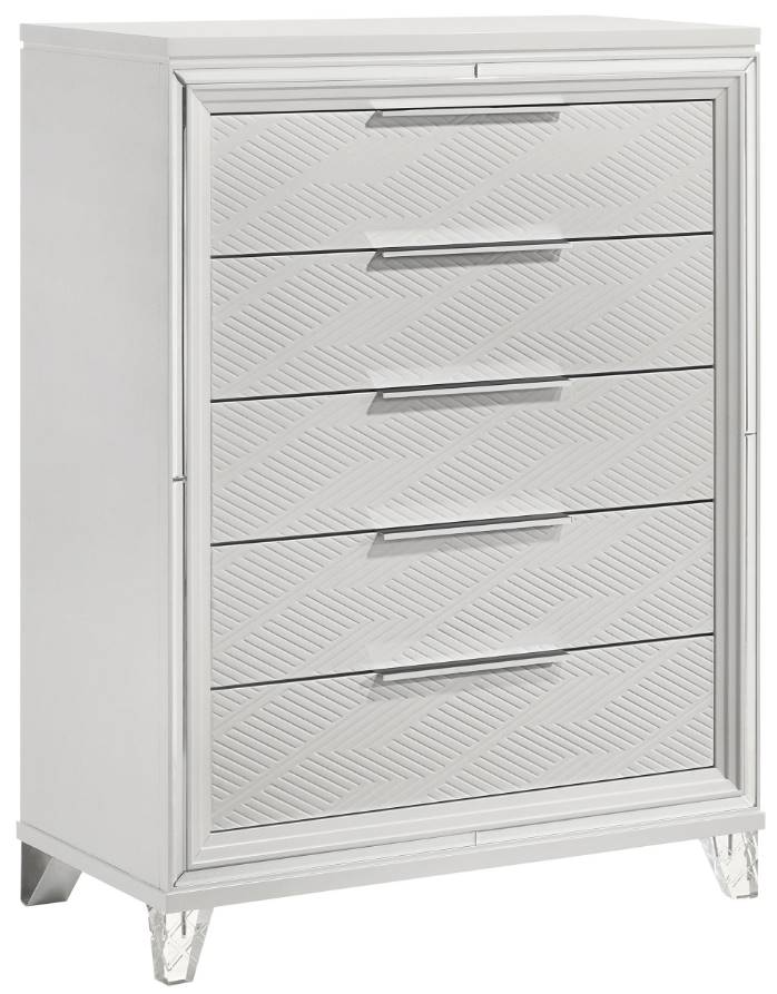 Maximize your bedroom storage with this stylish 5-drawer chest, featuring a modern Italian design. The white finish and picture framed recessed panels with embossed herringbone graphic patterns create a sophisticated look. Accented with mirror framing, acrylic legs, and polished chrome metal hardware, this chest offers ample storage space.Read More