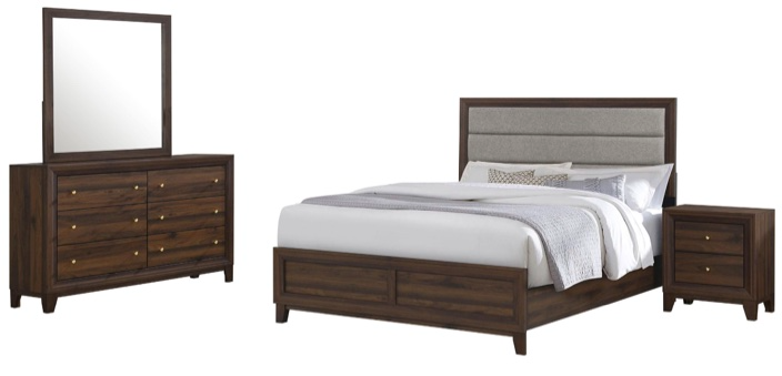 Create a chic, inviting retreat from the world with this modern wooden bedroom set. In a rich walnut wood finish, it imparts sophistication with a padded, upholstered headboard on the bed and drawers that are dotted with gold finish round knobs. The bed is complete with plush foam cushioning and taupe fabric, and features a tall headboard paired with a low footboard for an open look in your bedroom. Storage pieces add an austere, refined look with mitered trim work and tapering legs that add angularity. The set is crafted with durable engineered wood and features laminate surface that resist dents and scratches from everyday use to maintain a fresh, beautiful look.Read More