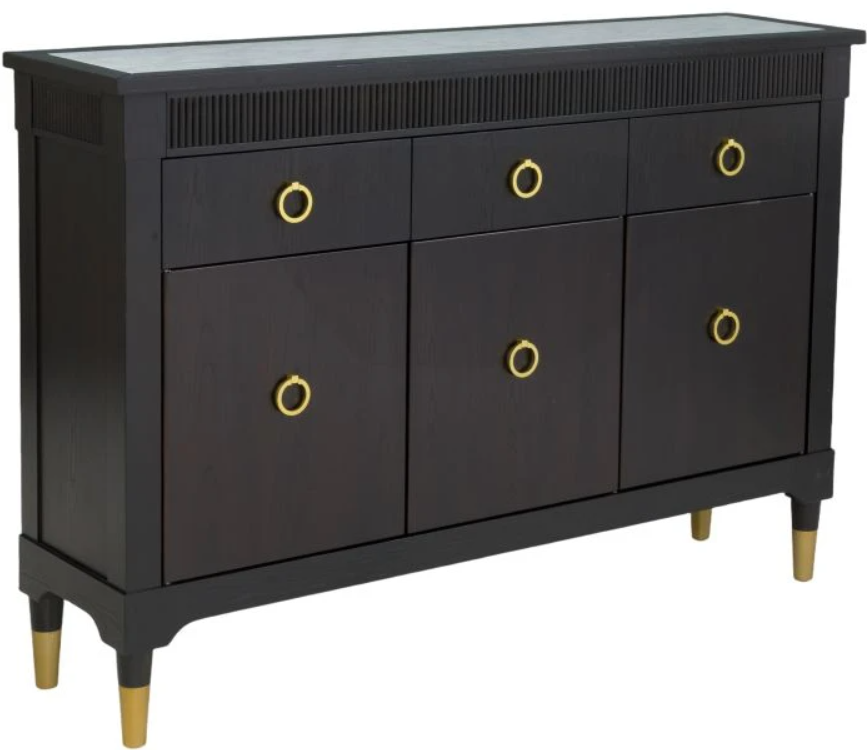 Finished in Graphite with brass accents, a marble inset top, three top drawers, three base level doors, and one adjustable shelf behind each door.