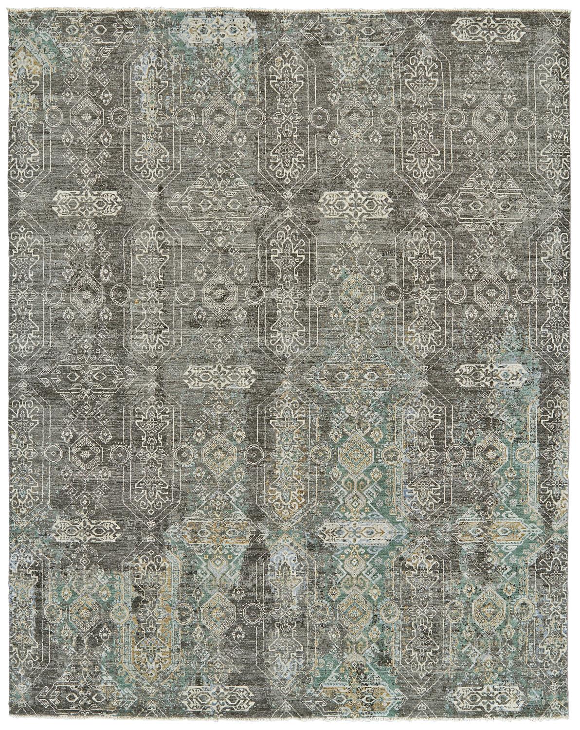Monochromatic tones of gray accented by subtle pops of blue lend the Dalia Collection a timeless elegance. Hand-knotted in India with hand carded hand spun wool these designs feature intricate all-over patterns with weathered effects to lend a new spin to traditional motifs. These one-of-a-kind pieces will create settings of sophistication in any room.