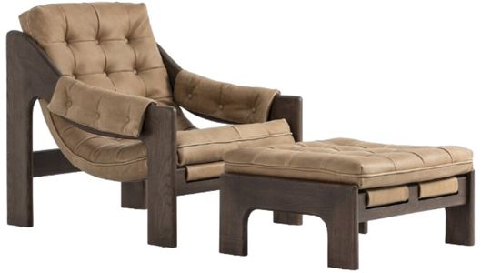 Dramatically tufted and angled for comfort, this Seventies-inspired sling seat is made from thick-cut top-grain leather in an earthy taupe, with wide brown ash framing. A plump, pronounced grain accentuates leather's natural markings for a supple, lived-in look. Paired with a matching ottoman for a complete lounging experience.Read More