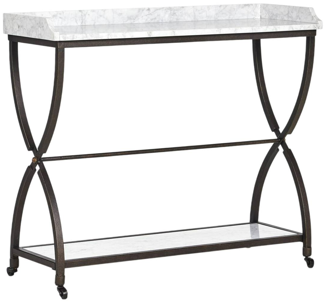 By the makers at Van Thiel, known for their antique-inspired pieces and hand-applied finishes. Textured bronze iron forms an elegant, airy frame for solid white marble shelves. Decorative casters add a fun finishing touch.Read More