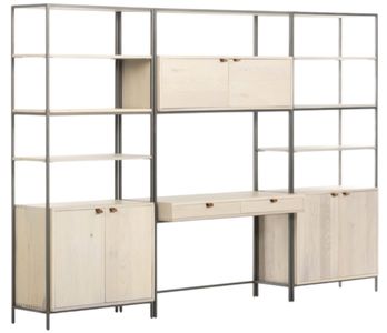 A mid-century-inspired design, greyish auburn poplar and raw iron fuse for a forward-thinking two-piece bookcase with modular capabilities, featuring generous storage space by way of open shelving, concealed cabinetry and dual drawers. Metalsecured pulls of top-grain leather add a fresh element of surprise.Read More