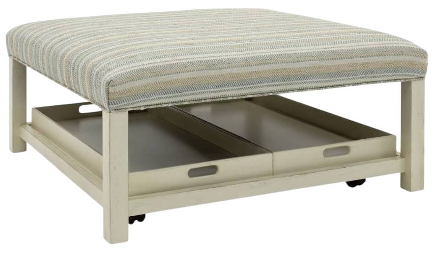 Available in round, square, oval or rectangle, the upholstered cocktail ottomans are available in a choice of more than 650 fabric options with tufted or non-tufted tops and a choice of eight finishes. An additional 15 Premier finishes – hand applied by our artisans – are also available, along with contrasting welt options and a choice of two sizes of nail-head detailing, available in four different finishes for further customization. Melding form with function, each style includes complementary solid wood serving trays for use in entertaining and hidden, locking casters for easy movement. The solid wood trays are crafted to nest on the cocktail ottomans’ bottom shelf for storage when not in use. Strategically placed wooden positioning pins on the bottom shelf help to lock the trays in place.