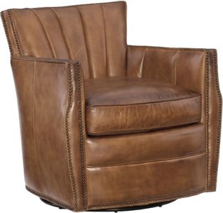 A fan-shaped back with vertical channeling and shaped arms accented by nailhead trim distinguish the timeless yet modern Carson swivel club chair. The chair is covered in the authentic and inviting aniline top grain handwiped checkmate pawn leather.Read More