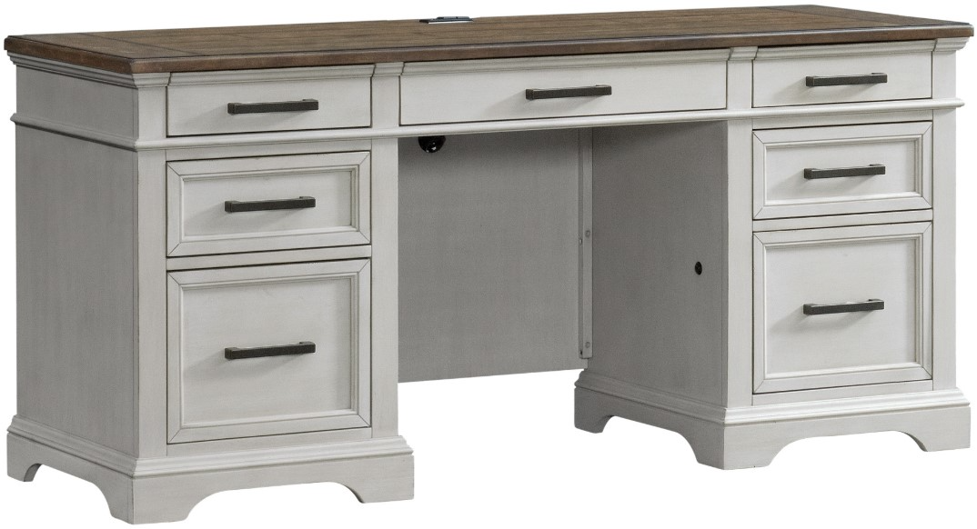 Drake home office offers a classic old world style, all case pieces have rustic oak plank board tops. This two-toned finish combines a relaxed antiqued gray finish with warm rustic oak patina. Solidly constructed and designed to function the way we work today.Read More