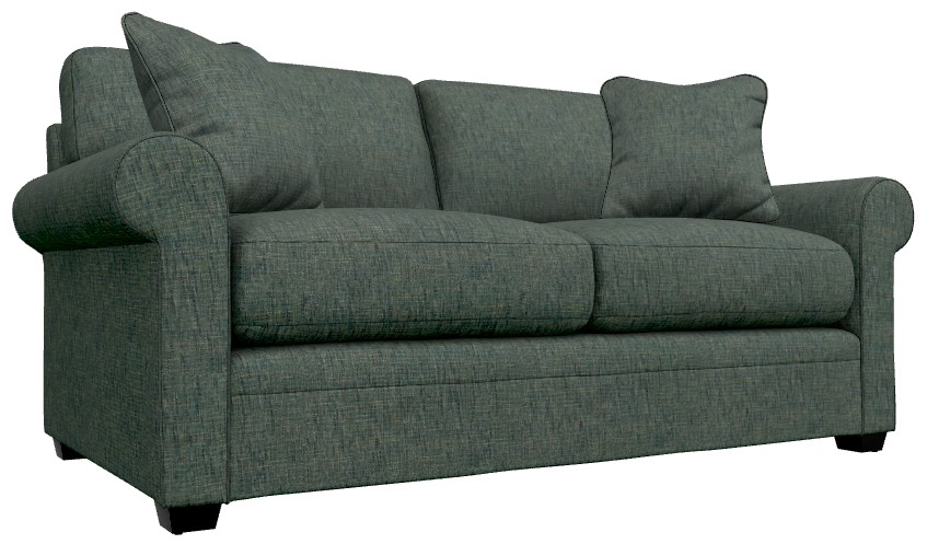Rolled arms, decorative wood legs and welt trim lend laid-back, sophisticated style