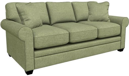 Rolled arms, decorative wood legs and welt trim lend laid-back sophisticated style