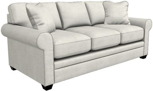 Rolled arms, decorative wood legs and welt trim lend laid-back sophisticated style