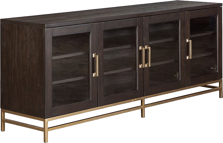 Lindon is available in two sizes (70-inch and 84-inch) and offered in a choice of Belgian Wheat or Coffee Bean finish accented with Burnished Brass Hardware. Its multifunctional design includes four framed, clear-glass doors that each open to reveal two interior adjustable shelves perfect for media storage and display. The 70-inch console is designed to display a TV up to 79”, the 84-inch model is designed for TV sizes up to 90”, and both add instant character to the room.