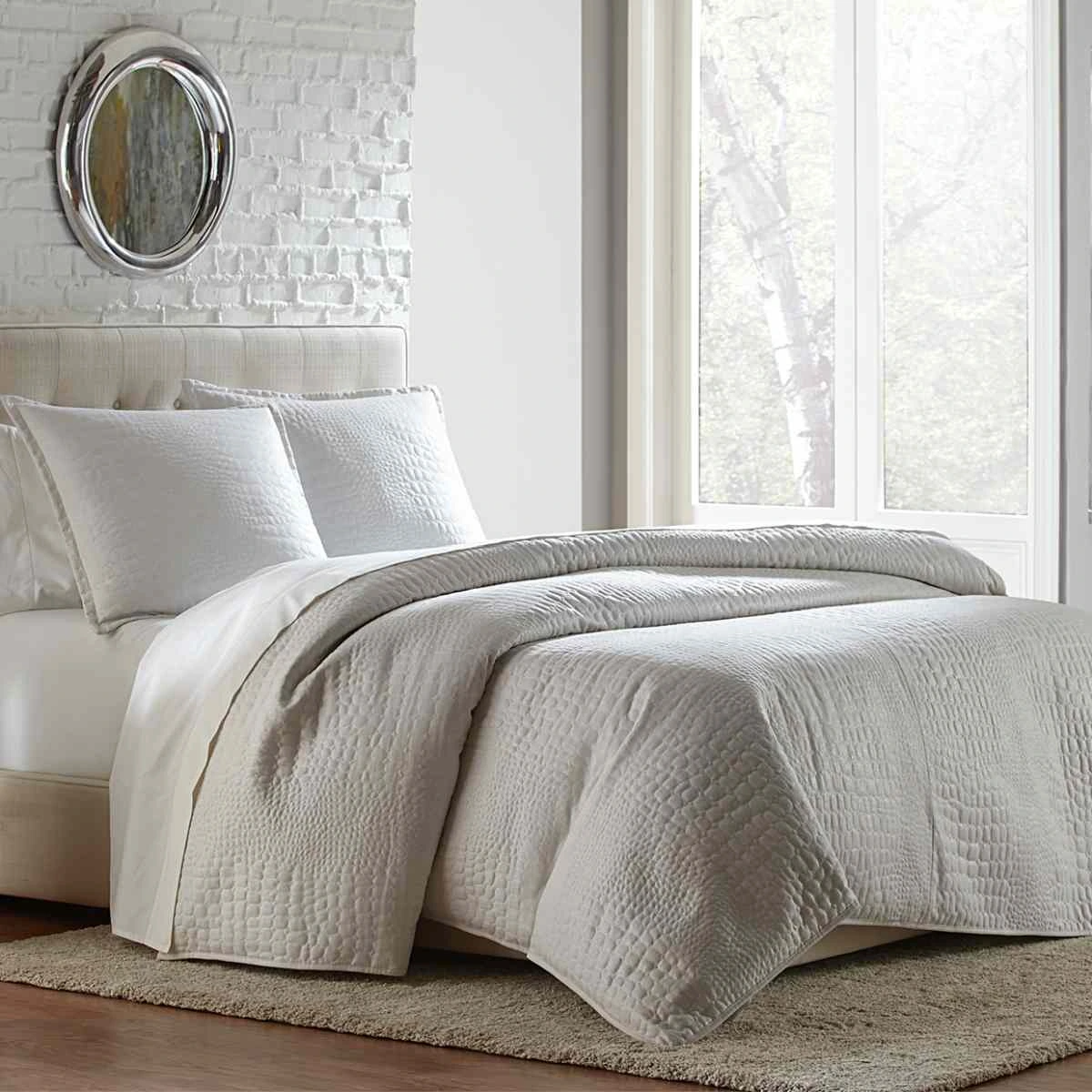 The Brilliance coverlet/duvet set is the perfect layering piece or alternative comforter for any modern bedding look! The silver metallic printed fabric adds a glamourous sheen to the pebble embroidery stitch pattern, and the fresh white color makes it instantly complementary to your existing décor.Read More