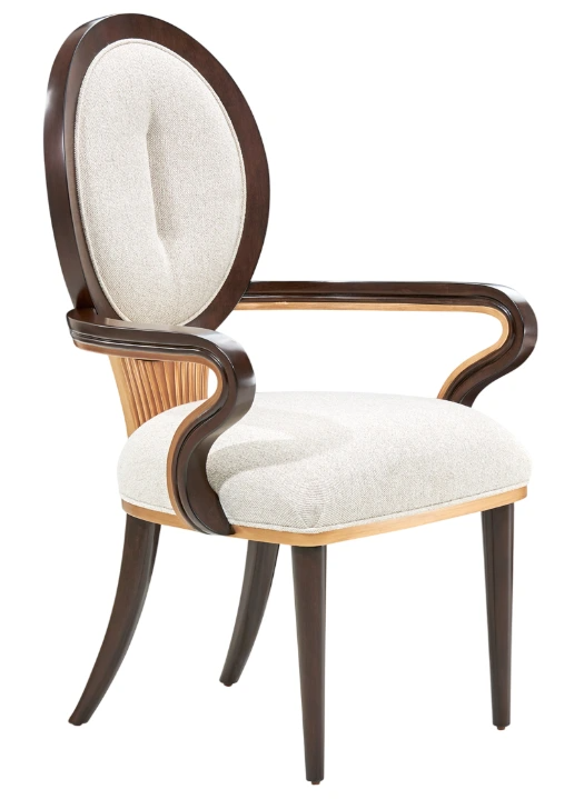 With its graceful silhouette and thoughtfully crafted details, the Camellia Field Dining Arm Chair is a statement of refined comfort. The oval back, adorned with camellia marquetry, pairs beautifully with the warm pecan finish and antique gold accents. Upholstered in soft chenille, it combines luxurious materials with a supportive design, offering an inviting and sophisticated dining experience.Read More