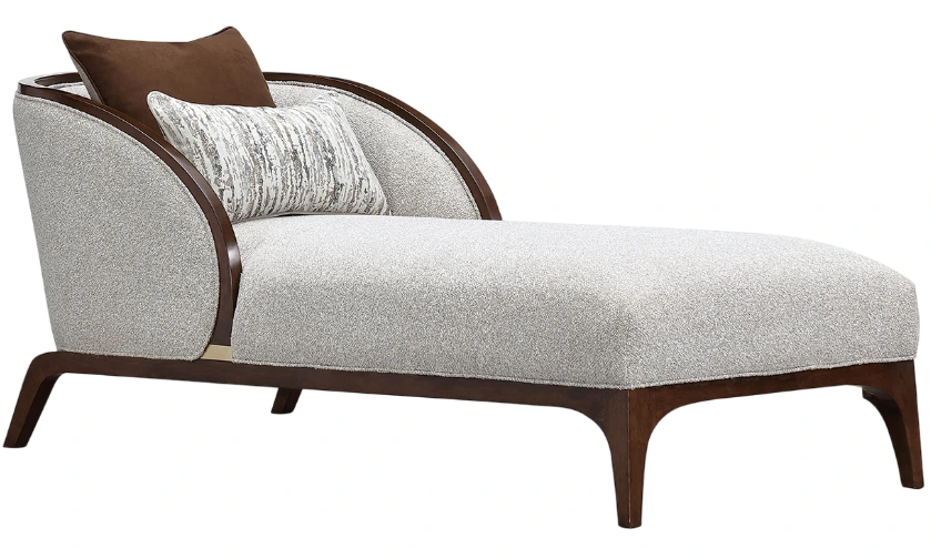 The Houston walnut chaise, upholstered in a mingled boucle fabric with soft hues of gray, ivory, and tan. The sculptural wood frame, finished in rich walnut with painted gold accents, adds a sophisticated contrast. A reversible feather-filled pillow provides a versatile touch to suit your aesthetic.Read More