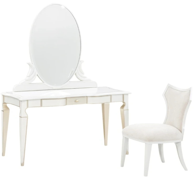 The La Marisia creamy pearl vanity set features birdseye maple veneer, adding a touch of organic elegance. A sculpted silhouette, raised details, and a faux-shagreen drawer front elevate its luxurious appeal. The coordinating chair boasts a chic, contoured design upholstered in cream chenille, with delicate welting that enhances its curves.Read More