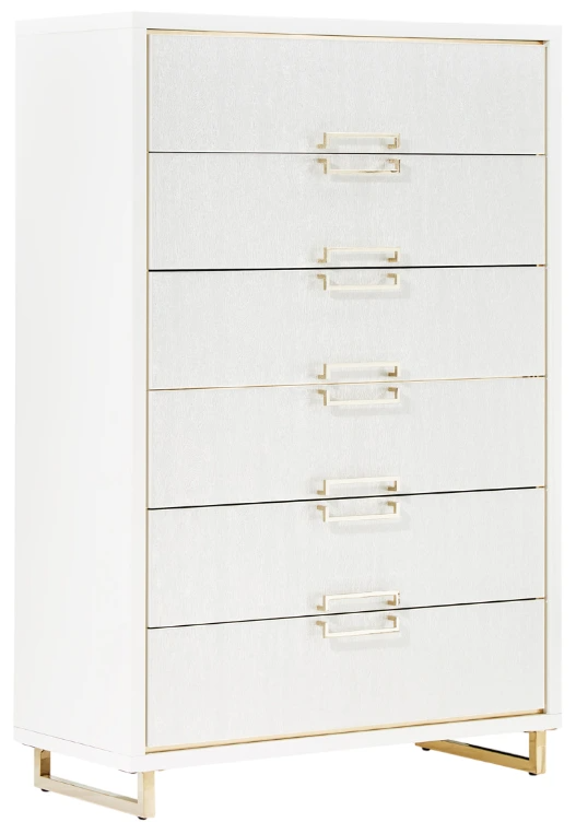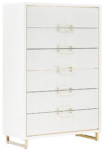 The Michael Amini® Palm Gate cloud white chest delivers refined coastal charm with its serene finish and Japan gold accents. Designed with multiple spacious drawers, it offers stylish and functional storage for your bedroom essentials.Read More