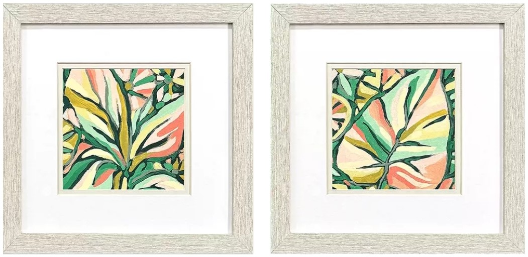 Brightly colored pink and green tropical leaf prints add a touch of whimsy. Matted in white and framed in a distressed whitewash finish molding, Candy Tropicals I wall art set by Vess and designer Jordan Glassco Smith brings playful coastal charm, perfect for energizing living rooms, bedrooms, or serene beach-inspired spaces.Read More