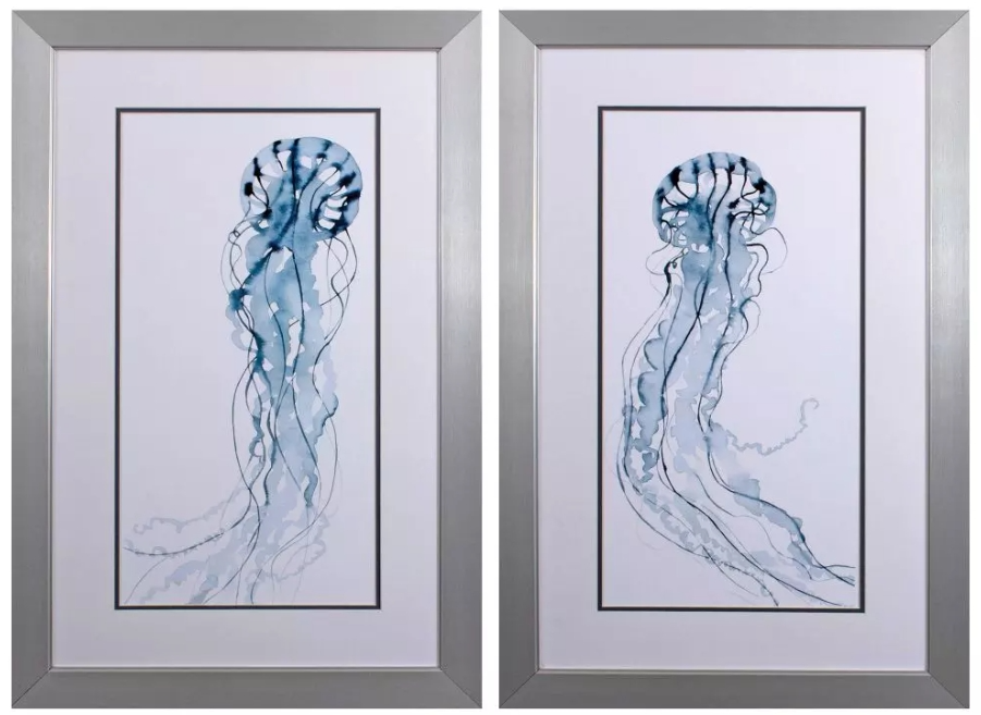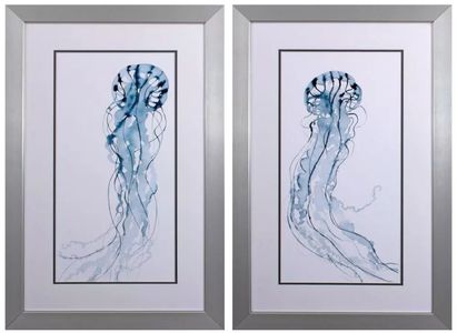 A set of two coastal jellyfish prints that are double matted, framed under glass and paired with a metallic silver frame. Whether placed in a living room, bedroom, or hallway, this artwork serves as a versatile accent piece.Read More
