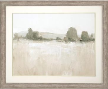 This wall art showcases a field and a distant tree line in shades of off-white, light tan, and green. This artwork is under glass, has a white matting, and a frame in distressed brown finish